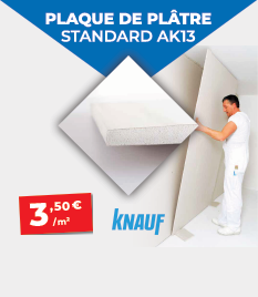 - La plaque de plâtre Standard AK13 de KNAUF à bords amincis à 3,50€/m² ;
